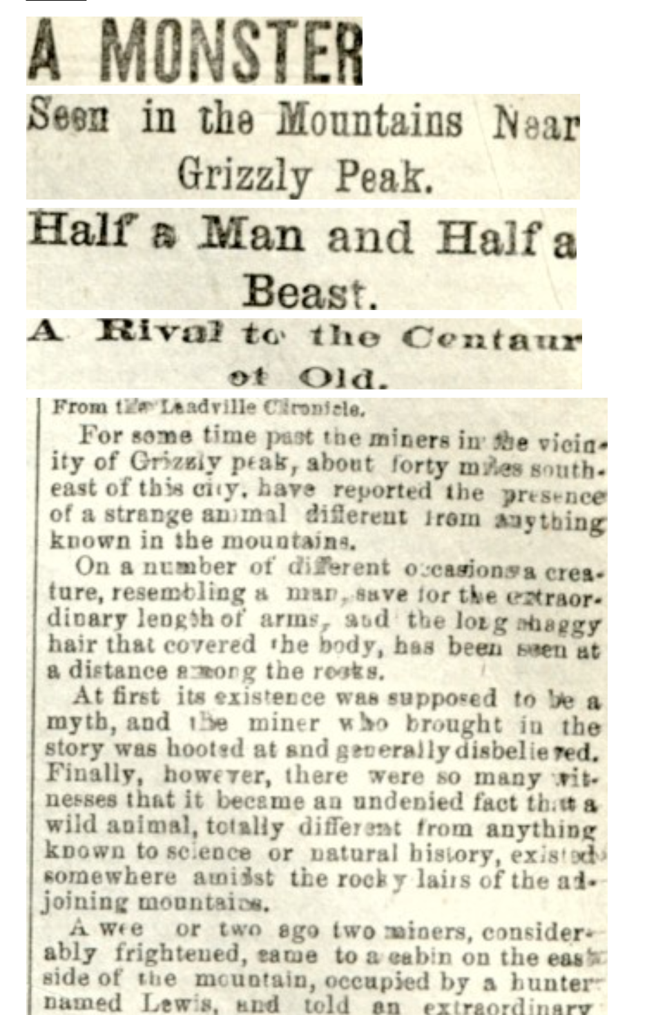 Oh and here is a strange article I found from the Rocky Mountain News 11/1/1880. Sounds like they are describing a sasquatch to me!?!